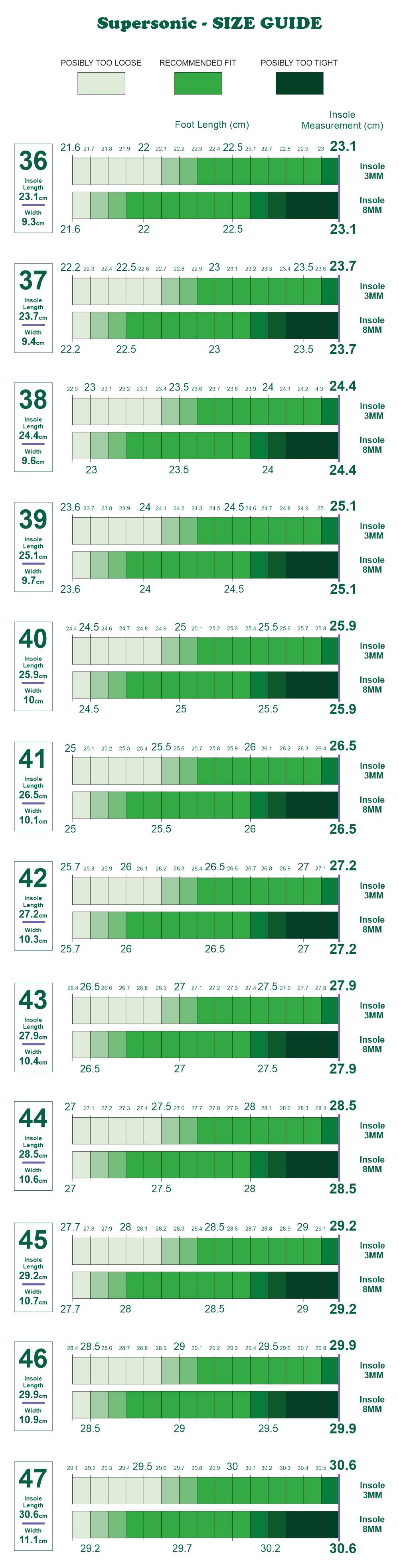 In our chart, you can see the insole measurements for each size and the width (shown in the box on the left).