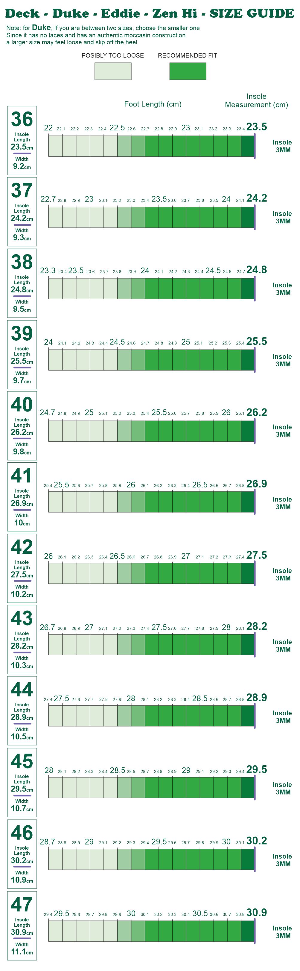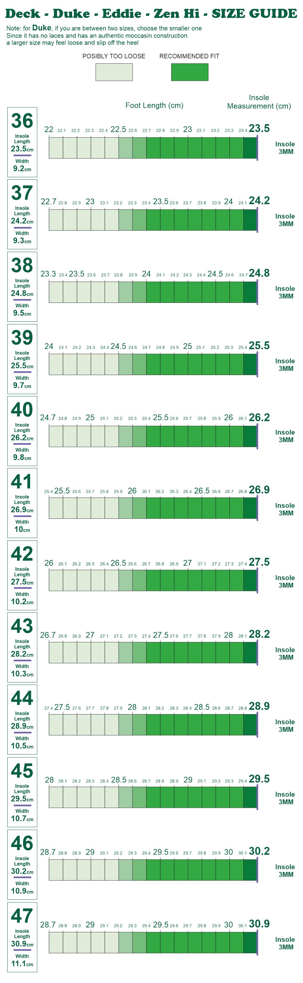 If you have very wide or full feet: If your measurement is in the dark green zone or near it, choose one size larger, except for the Duke model.