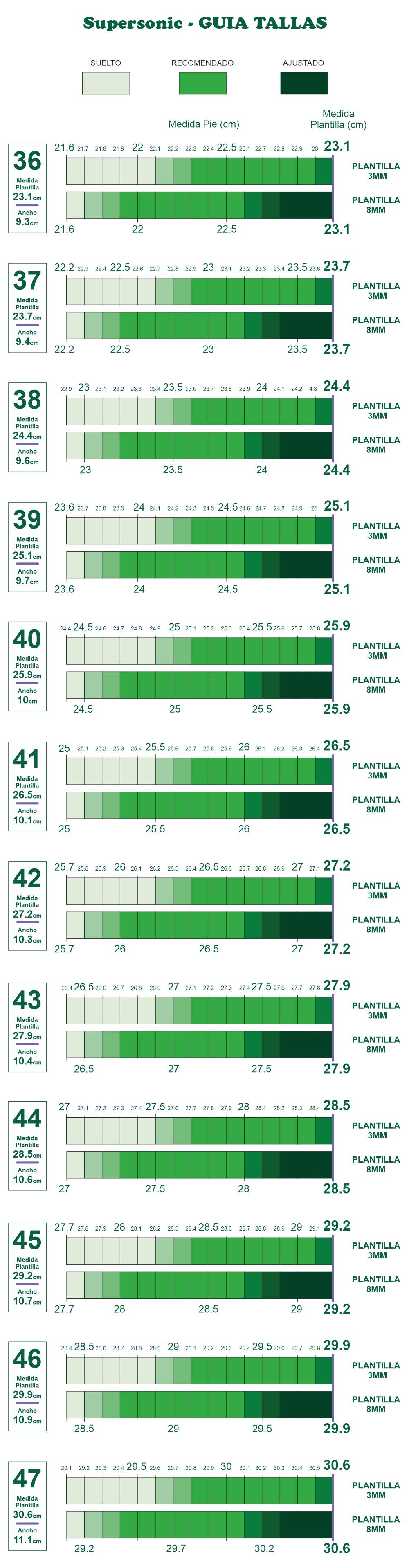 En nuestra tabla puedes ver las medidas de las plantillas de cada talla y el ancho (indicado en el recuadro de la izquierda).