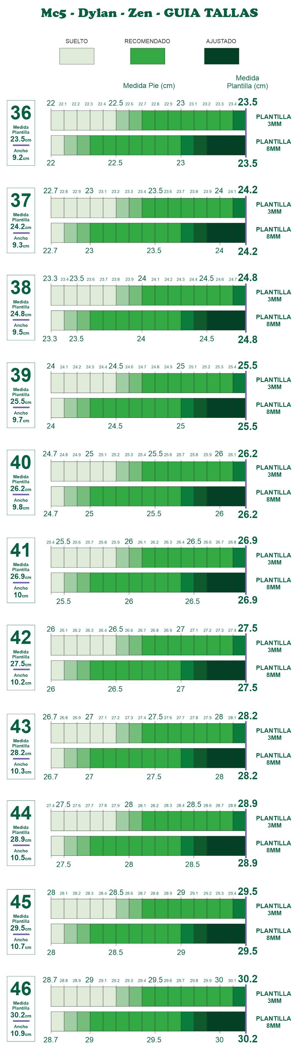 En nuestra tabla puedes ver las medidas de las plantillas de cada talla y el ancho (indicado en el recuadro de la izquierda).