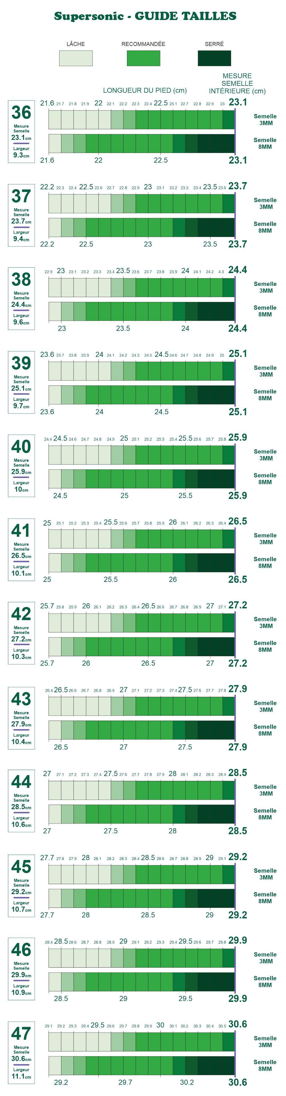 Nous recommandons de laisser jusqu’à 1 cm maximum de différence entre la mesure de votre pied et la longueur de la semelle intérieure selon vos préférences ; au-delà, cela pourrait sembler trop large.les encadrés à gauche, vous pouvez voir la longueur et la largeur de la semelle en centimètres.