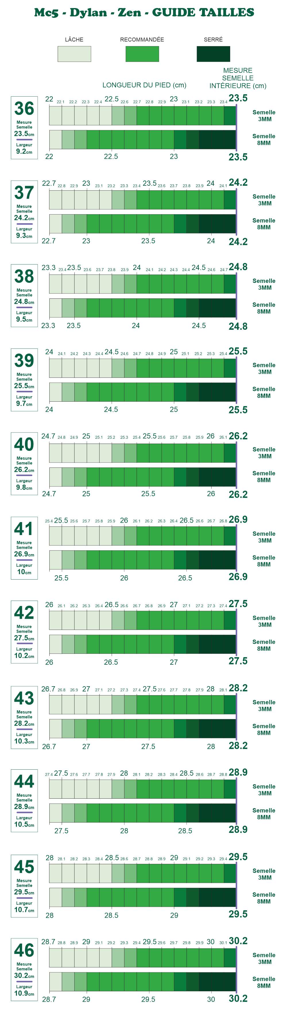 Dans notre tableau des tailles, vous pouvez voir les mesures des semelles intérieures pour chaque pointure et la largeur (indiquée dans le cadre à gauche).
