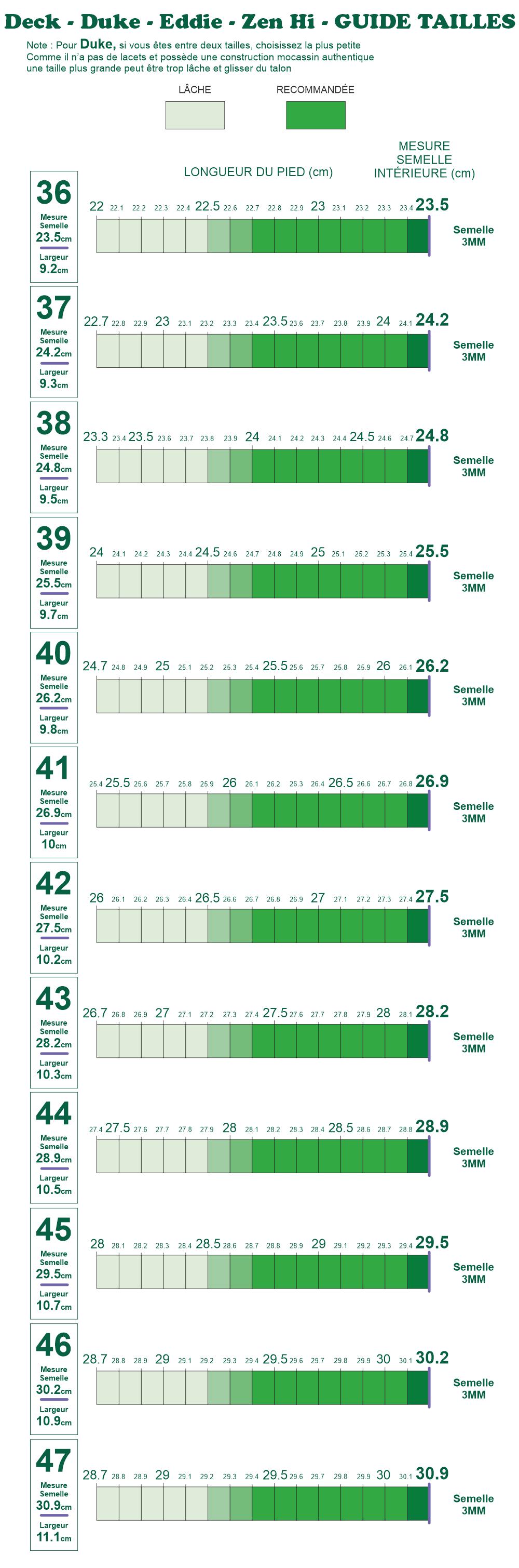 Si vous avez des pieds très larges ou volumineux : Si votre mesure se situe dans la zone vert foncé ou près de celle-ci, choisissez une taille au-dessus, sauf pour le modèle Duke.